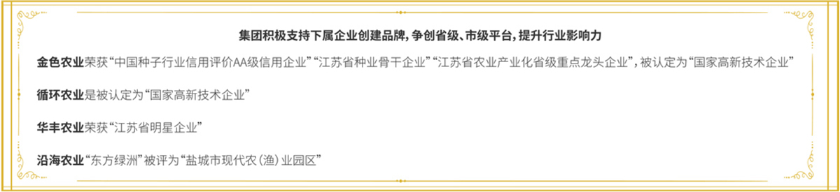 公司除開展日常經營業務外,還高度重視農業科技運用,孵化培育有國家高新技術企業2家,設有1個博士后工作站、3個研究生工作站,建有農業部可再生能源清潔化利用實驗基地、江蘇省優質稻麥工程技術研究中心、鹽城市工程技術研究中心、鹽城市市級企業技術中心、鹽城市農機化科技示范基地,已通過國家、省級審定品種20個,申報各類專利84項,不斷探索和應用現代農業科技,為傳統農業賦能增效。