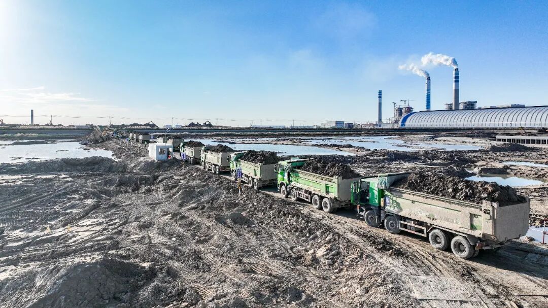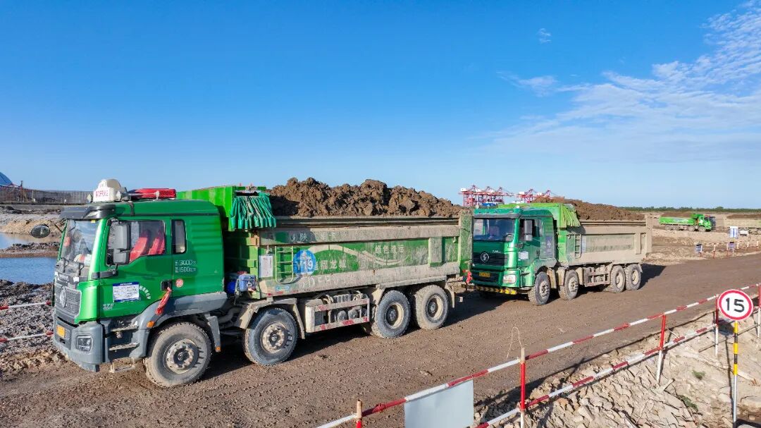 多臺(tái)挖掘機(jī)、運(yùn)輸車往來(lái)穿梭