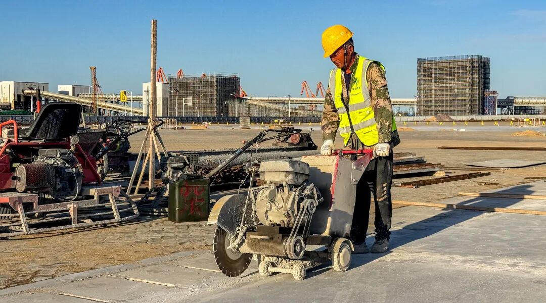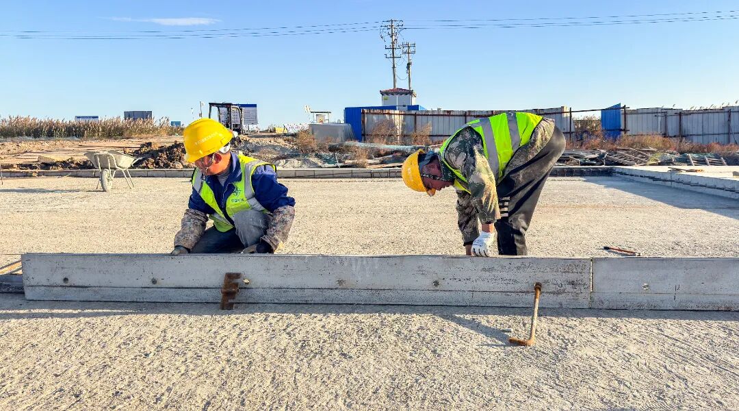 工人們正進(jìn)行混凝土面層收尾作業(yè)