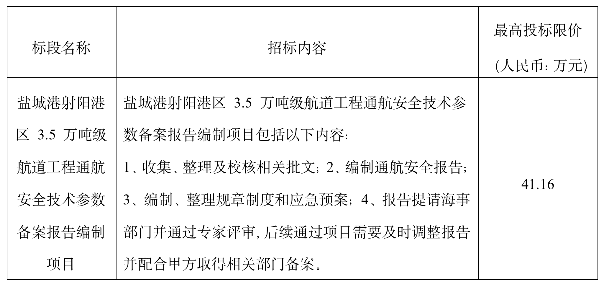 (5)項目標段劃分:鹽城港射陽港區 3.5 萬噸級航道工程通航安全技術參數備案報告編制項目共劃分1個標段,標段信息如下: