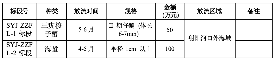 ①SYJ-ZZFL-1標(biāo)段:包括三疣梭子蟹的人工增殖放流,采購(gòu)費(fèi)為50萬(wàn)元。