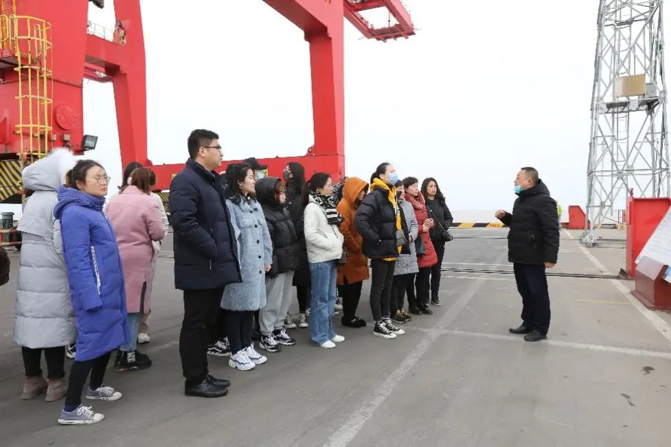 濱海港區(qū)單位女職工在生產經營部工作人員的帶領下,學習門機進行裝卸作業(yè),了解碼頭從船舶靠岸的前期準備到靠泊后的裝卸作業(yè)的全部流程。