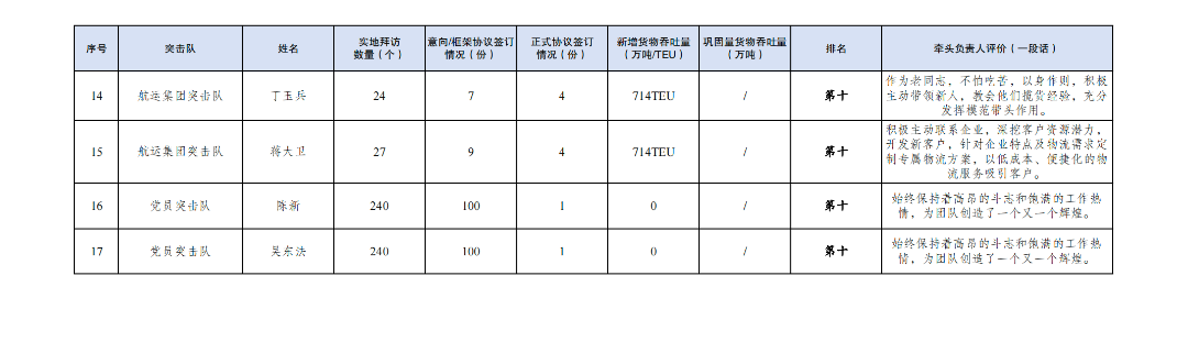 3.簽訂正式協議數量74份:其中響水港區突擊隊16份,巾幗突擊隊11份,航運集團突擊隊9份,大豐港區突擊隊7份,射陽港區突擊隊6份,多式聯運第二突擊隊6份,黨員突擊隊5份,濱海港區突擊隊4份,建湖港區突擊隊3份,阜寧港區突擊隊3份,亭湖港區突擊隊2份,多式聯運第一突擊隊1份,青年突擊隊1份。