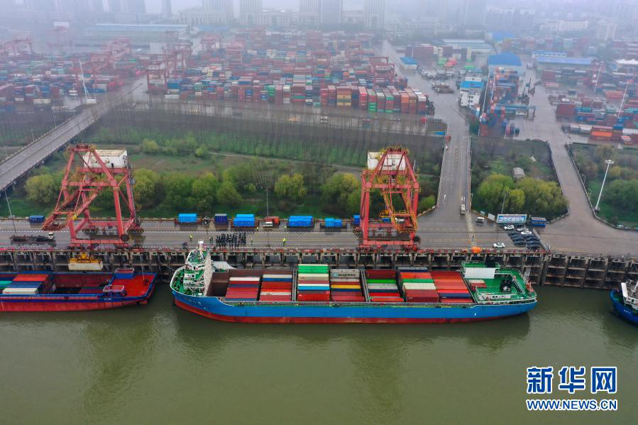 2月28日,停靠在碼頭的“漢海5號”準(zhǔn)備首航駛往上海洋山港(無人機(jī)照片)。新華社發(fā)(趙軍 攝)