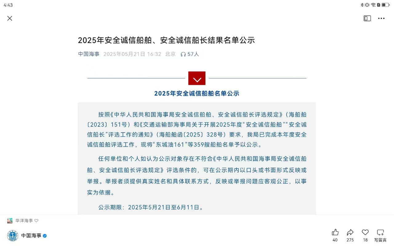 “安全誠信船舶”是國內航運業的最高榮譽,由地市級、省級海事管理機構層層篩選,從申請主體的近三至五年的安全檢查、事故險情、違章處罰等各項表現進行全面“過篩”,最終由交通運輸部海事局組成專門的評選委員會進行審查認定并向社會公布。獲評該榮譽的船舶可以享受延長24個月檢查窗口期等一系列便利化措施。