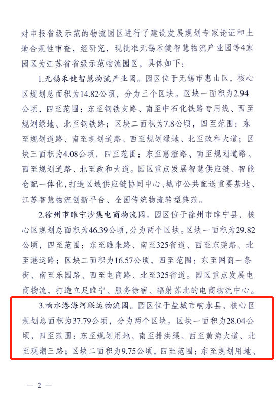 喜訊!近日,響水港海河聯運物流園被省發改委批準為江蘇省省級示范物流園區。