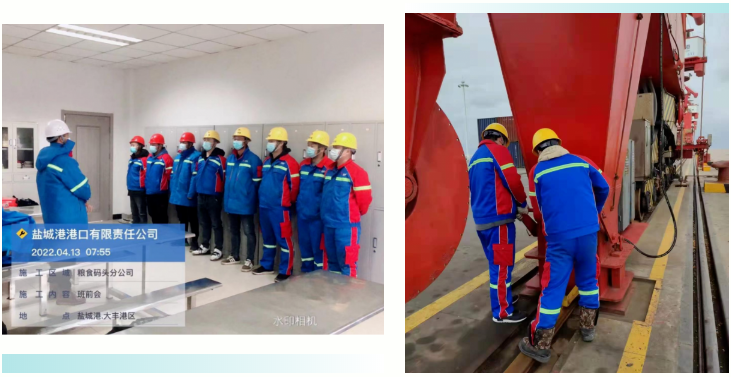 散貨碼頭分公司領導干部帶頭實施24小時值班制度,保障通訊暢通,及時掌握碼頭實時情況。維保人員全力將碼頭機械進行防風錨定,安全及設備人員復查確認,全面排查安全隱患,收回室外高空的積物,以防意外墜落,關閉好門窗,切斷機械設備電源,用強有力的手段應對惡劣天氣影響。