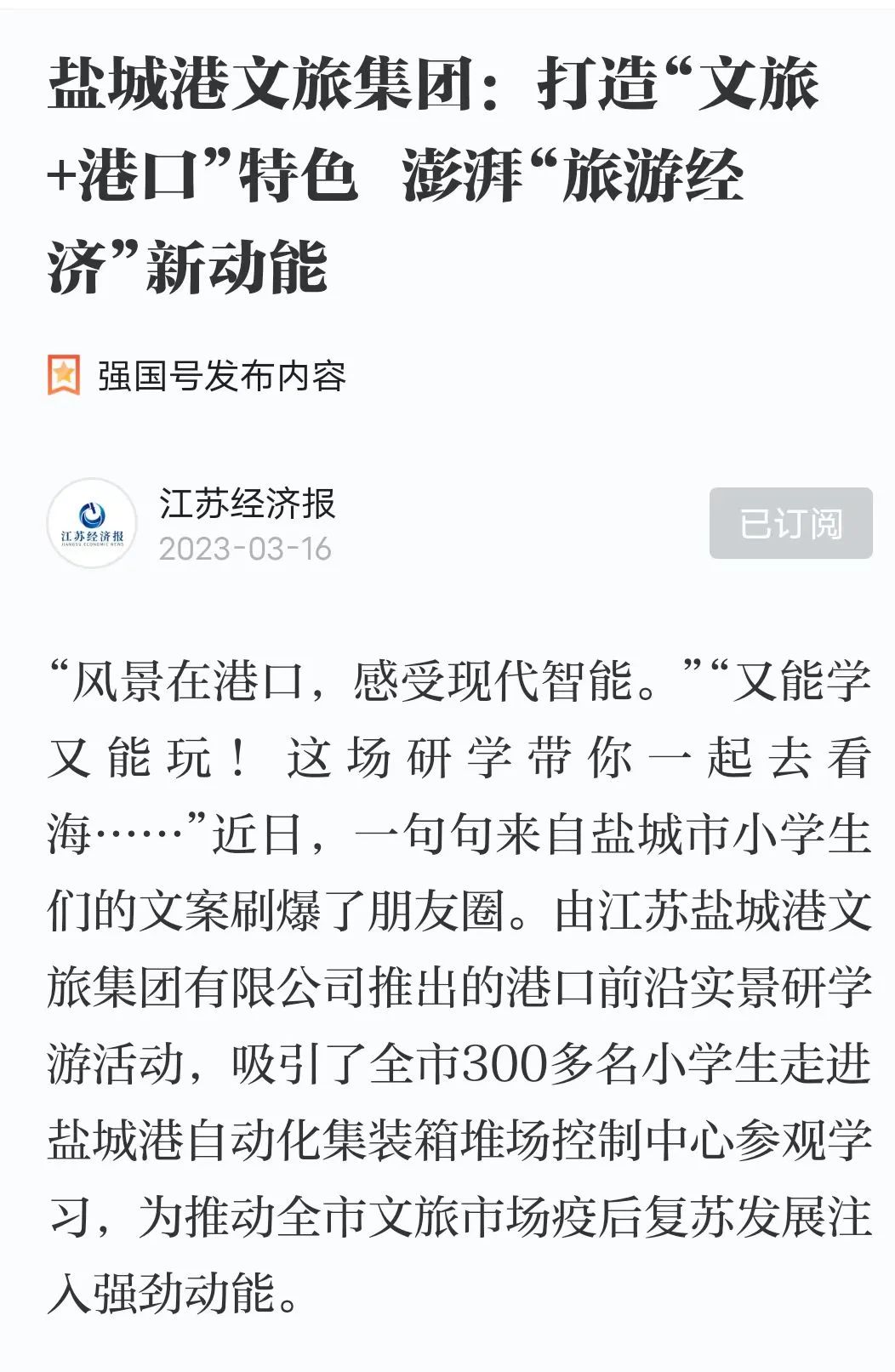 近日,江蘇經濟網、江蘇經濟報、學習強國等多家主流媒體平臺集體為鹽城港文旅集團點贊!以《鹽城港文旅集團:打造“文旅+港口”特色 澎湃“旅游經濟”新動能》為題對文旅集團在推動全市文旅市場疫后復蘇發展方面取得的成績進行了報道。
