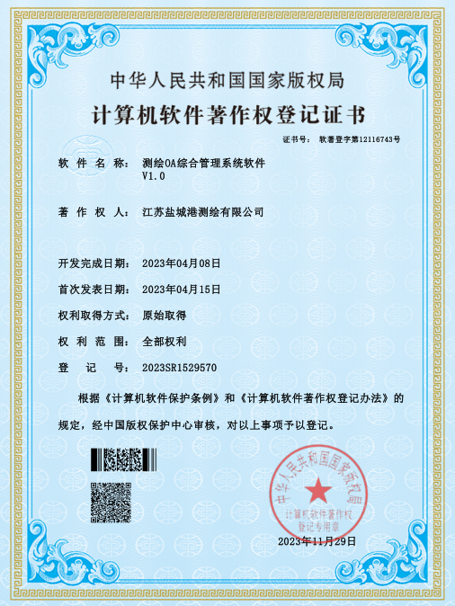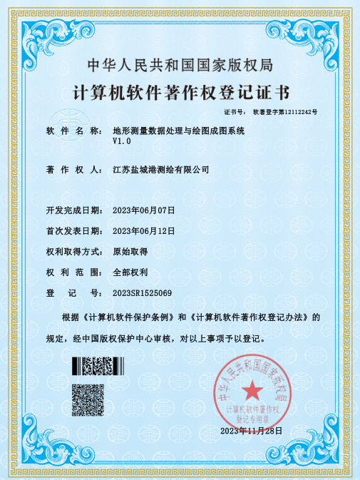鹽城港港航勘測設計公司一直高度重視技術發展創新和知識產權保護,現已獲得測繪OA綜合管理系統軟件、地形測量數據處理與繪圖成圖系統、航空攝影測量數據采集軟件、三維建模數據處理和信息管理軟件、土地勘界報告管理系統軟件五項軟件著作權。