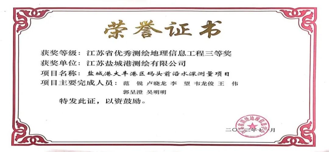 近日,江蘇省測繪地理信息學會公布2023年度江蘇省優秀測繪地理信息工程獲獎名單,鹽城港大豐港區碼頭前沿水深測量項目榮評2023年度江蘇省優秀測繪地理信息工程三等獎。