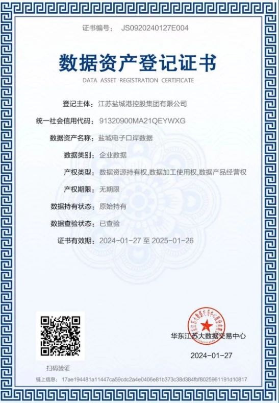 日前,鹽城電子口岸系統(tǒng)通過(guò)數(shù)據(jù)資產(chǎn)質(zhì)量評(píng)價(jià)及價(jià)值評(píng)估,評(píng)估值達(dá)910萬(wàn)元,并獲得《數(shù)據(jù)資產(chǎn)登記證書》,成為全國(guó)首個(gè)電子口岸系統(tǒng)數(shù)據(jù)資產(chǎn)入表案例。