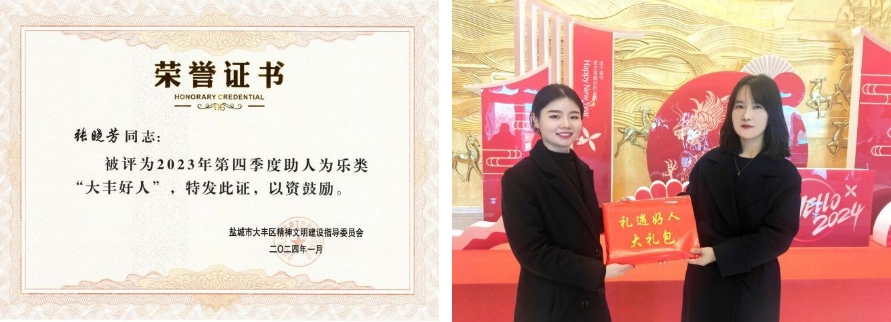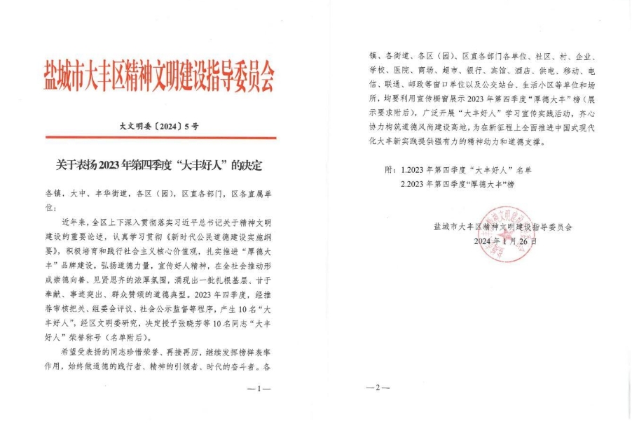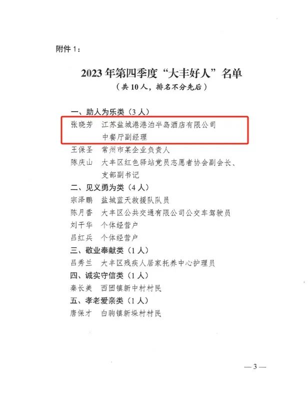 近日,鹽城市大豐區大力培育和踐行社會核心價值觀,積極開展2023年第四季度“大豐好人”推薦評選表彰活動,著力唱響“厚德大豐”品牌。經推薦審核把關、組委會評議、社會公示監督等程序,江蘇鹽城港港泊半島酒店有限公司張曉芳同志被授予“大豐好人”榮譽稱號。