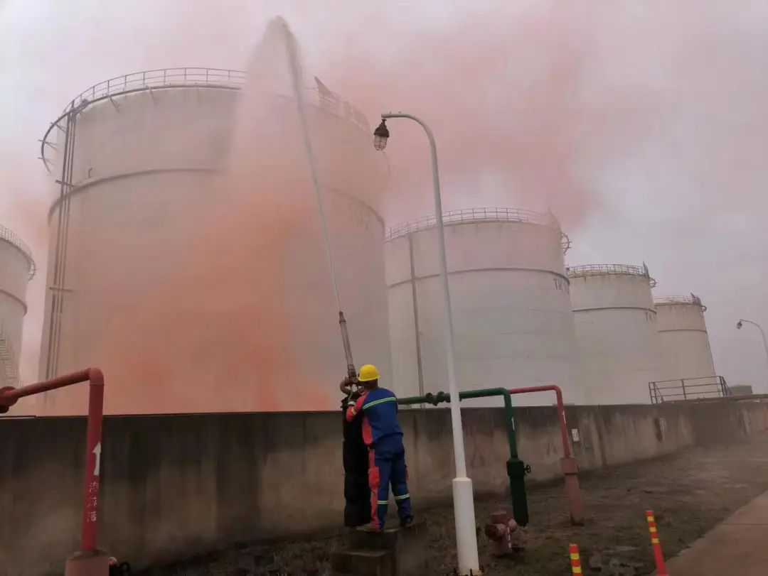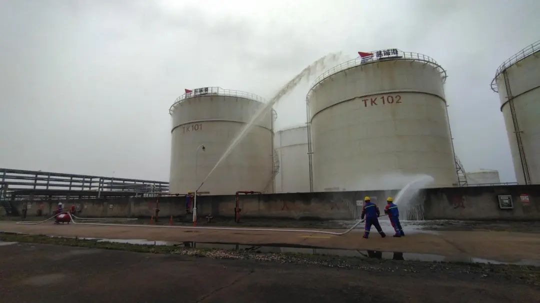 火情失控后,應(yīng)急搶險(xiǎn)組用移動泡沫裝置滅火,并開啟噴淋對儲罐降溫,同時(shí)使用水炮對儲罐加強(qiáng)降溫。在各小組的有序配合下,本次演練圓滿結(jié)束。