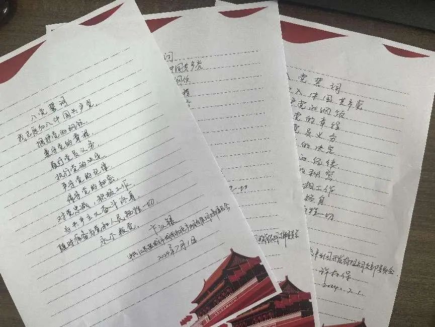 一筆一劃,書寫的是對(duì)黨的莊嚴(yán)承諾;一撇一捺,凝聚的是對(duì)黨的無限忠誠。黨員們懷著崇敬的心情,手握鋼筆,認(rèn)真地抄寫著每一個(gè)字。每一個(gè)筆畫都充滿力量,每一句誓言都飽含深情。