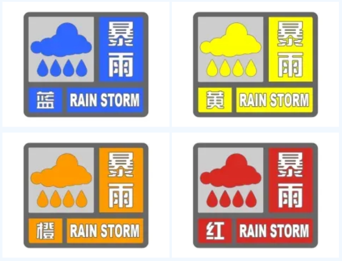 中國(guó)氣象上規(guī)定,24小時(shí)降水量為50毫米或以上的雨稱(chēng)為“暴雨”。按其降水強(qiáng)度大小又分為三個(gè)等級(jí),即24小時(shí)降水量為50~99.9毫米稱(chēng)“暴雨”;100~250毫米之間為“大暴雨”;250毫米以上稱(chēng)“特大暴雨”。暴雨預(yù)警信號(hào)的等級(jí)分為四個(gè)等級(jí),Ⅳ級(jí)(一般)、Ⅲ級(jí)(較重)、Ⅱ級(jí)(嚴(yán)重)、Ⅰ級(jí)(特別嚴(yán)重),分別用藍(lán)色、黃色、橙色、紅色中英文圖標(biāo)標(biāo)識(shí)。