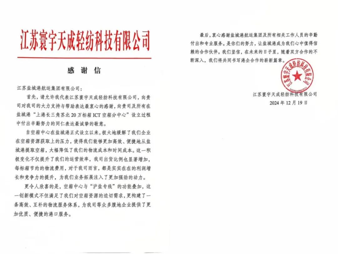 近日,鹽城港航運(yùn)集團(tuán)收到江蘇寰宇天成輕紡科技有限公司一封飽含濃濃謝意的信箋,信中字字深情,句句滾燙,高度贊揚(yáng)了鹽城港為“上港長三角蘇北20萬標(biāo)箱ICT空箱分中心”的設(shè)立啟用所付出的努力,并對鹽城港航運(yùn)集團(tuán)主動作為、精誠服務(wù)、共贏發(fā)展的合作精神表示衷心感謝。