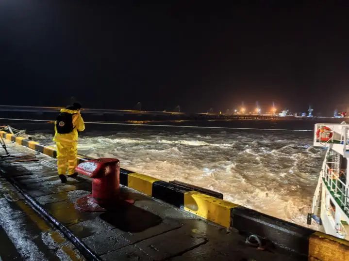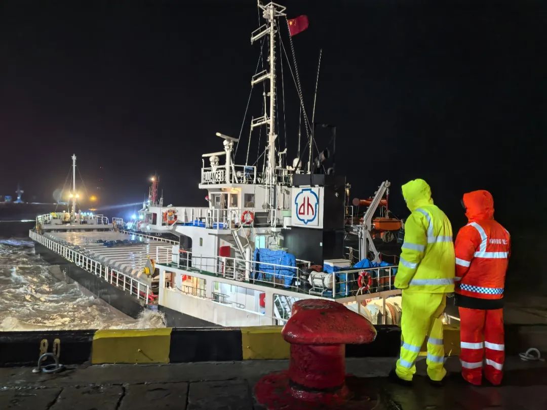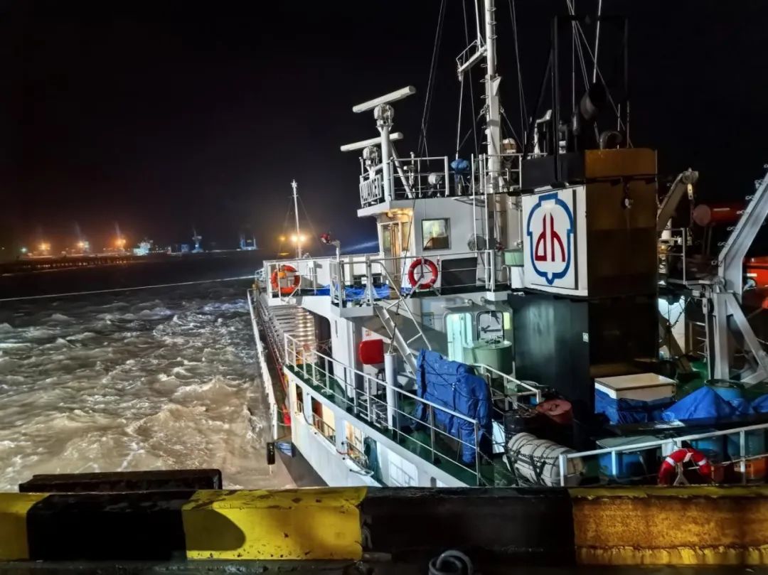 當晚正值農歷大潮汛,東北風6級、涌浪2米的惡劣海況給救援帶來嚴峻挑戰。引航員抵達現場時,“聯盟8”輪船頭僅剩1根倒纜受力,船體與碼頭形成60°夾角持續后漂,且涌浪過大導致無法登輪指揮。面對險情,引航員在碼頭前沿與交管中心協同決策,果斷采取“解尾纜、控船位”的應急處置方案。