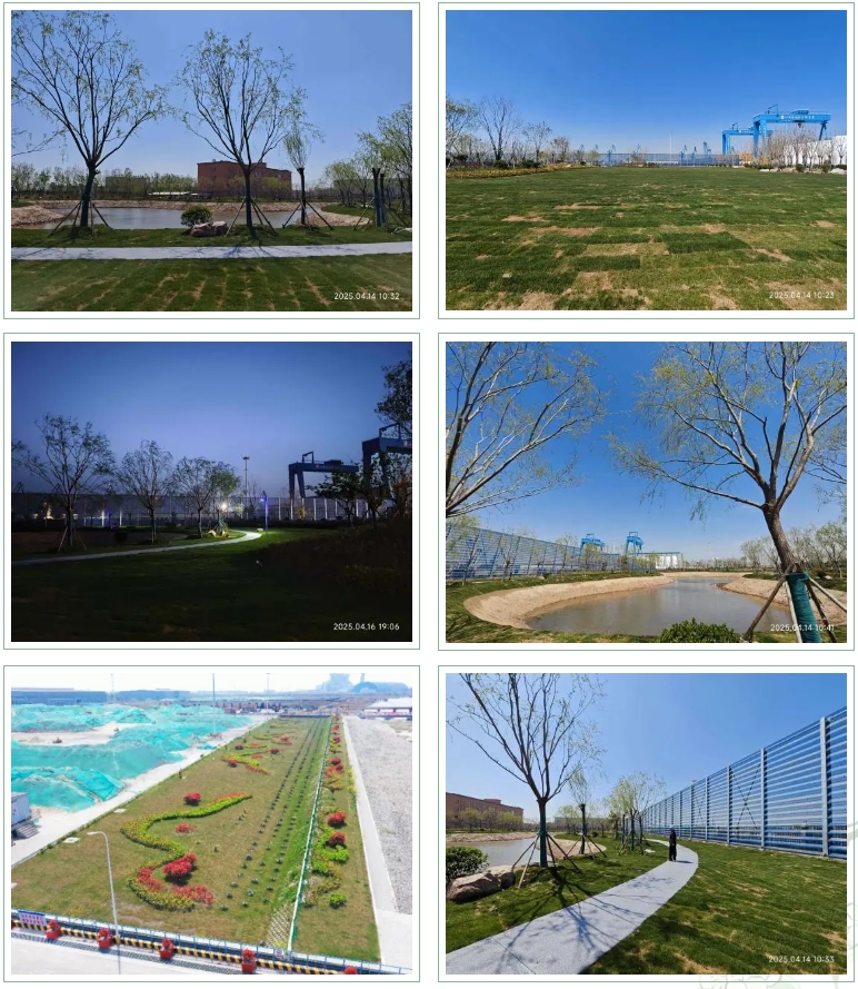 依托科學(xué)規(guī)劃,利用自有苗圃中的喬木、灌木及地被植物,建設(shè)錯落有致的立體綠化景觀,改善港口工作生活環(huán)境。按流體力學(xué)原理設(shè)計:40%透風(fēng)孔隙率、0.6風(fēng)速衰減系數(shù),形成梯度式生態(tài)屏障,防風(fēng)林帶與景觀花徑相交織,長成后將有效實現(xiàn)"抑塵+降噪+碳匯"三重效能,為港口披上“生態(tài)外衣”,實現(xiàn)生產(chǎn)與自然的和諧共生。