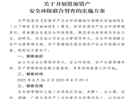緊扣資源資產安全環保管理核心,組織多部門開展聯合督查行動,對公司自有及托管的土地、辦公樓、住宅、商鋪、廠房等資源資產進行檢查。創新采用“共性+分類”雙維度檢查模式:在共性層面,重點檢查承包承租單位資質、安全環保協議簽訂及交底執行情況,有效壓實主體責任;在分類層面,則依據資產特性實施差異化檢查。其中,針對土地資產重點排查警示標識缺失問題與污染風險,對商鋪全面排查燃氣安全隱患,對廠房重點檢查電氣線路敷設規范、消防設施完備性、“三違”現象及特種設備合規性等,切實保障督查工作精準高效、全面無遺漏。
