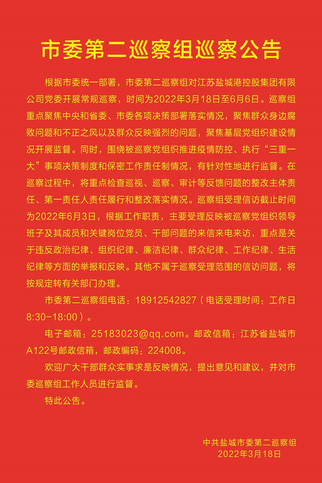 市委第二巡察組巡察公告