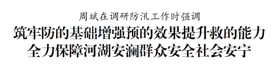 5月15日下午,市委書記周斌調研防汛工作。他強調,要深入學習貫徹習近平總書記關于防汛救災工作的重要講話重要指示精神,認真落實全國和全省防汛抗旱工作電視電話會議部署要求,堅持人民至上、生命至上,強化底線意識、極限思維,以“時時放心不下”的責任感和“事事心中有底”的行動力,做好應對極端天氣的充足準備,織密筑牢嚴密防線,全力保障我市河湖安瀾、群眾安全、社會安寧。